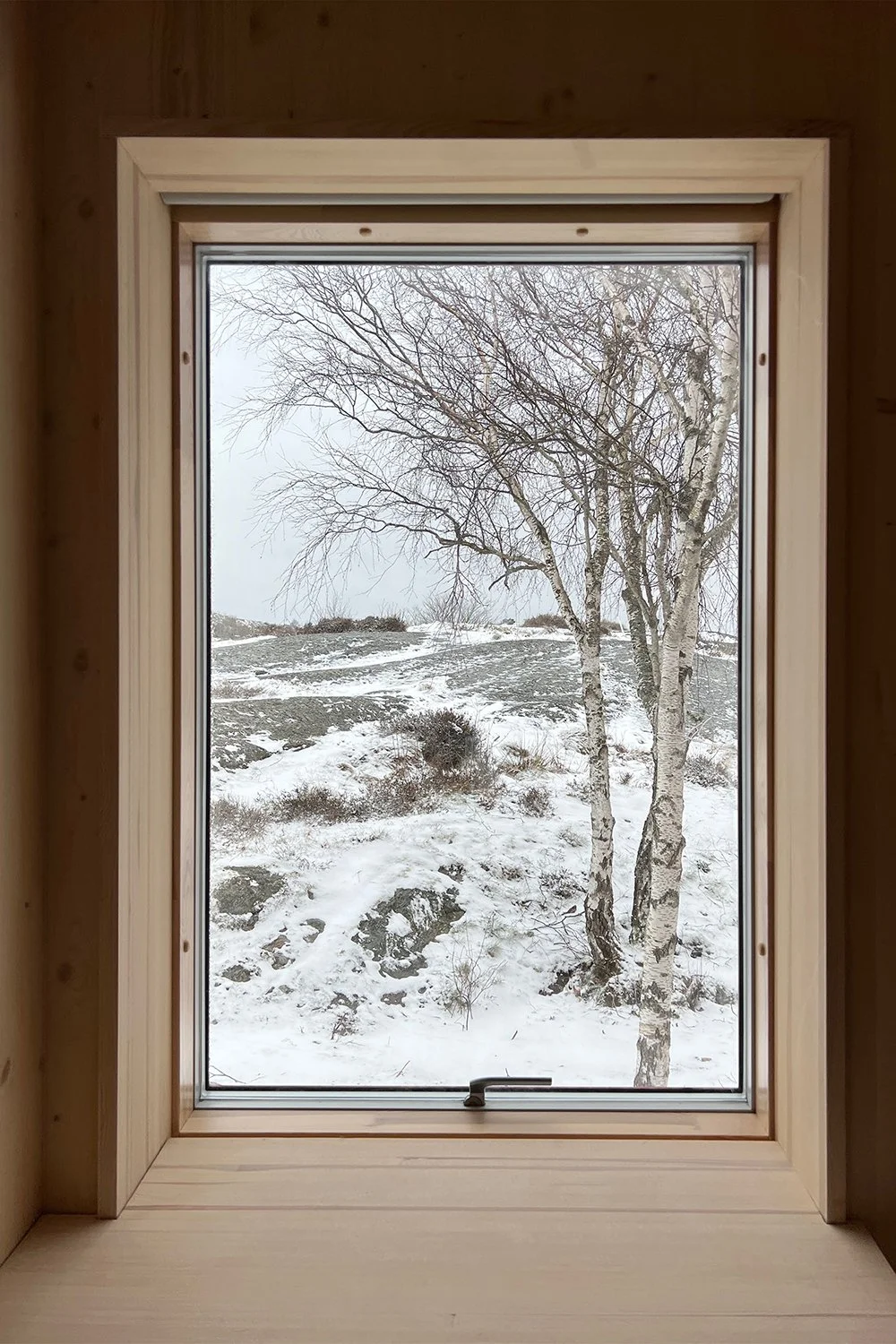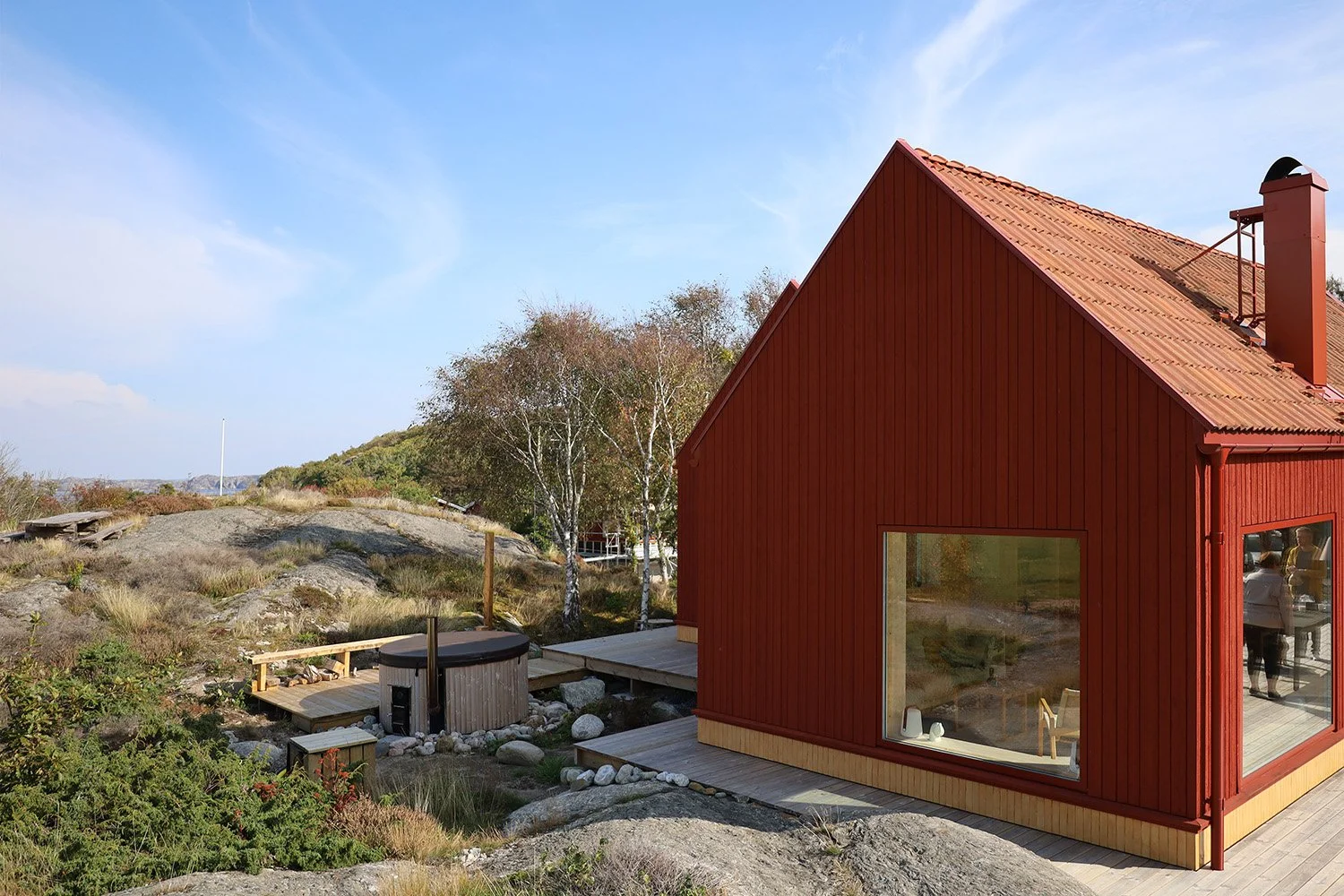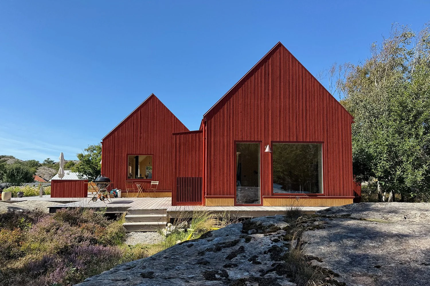 Ett hus på västkusten byggt i KL-trä. Klätt med en slät faluröd panel. Två volymer möter varandra likt sjöbodar längs en klippkant. En förskjutning mellan byggnadskropparna skapar fler rumsligheter, fler platser för sol, fler platser för lä. Siktlinjerna genom huset är många.